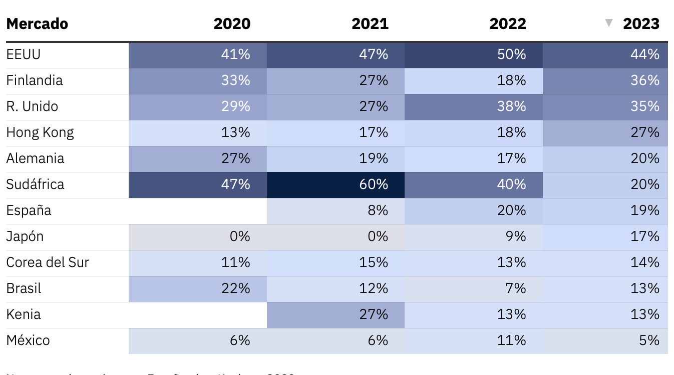 Fuente: Datos recogidos por el Instituto Reuters sobre el género de los directores en 200 medios en 2020 y en 240 medios entre 2021 y 2023.