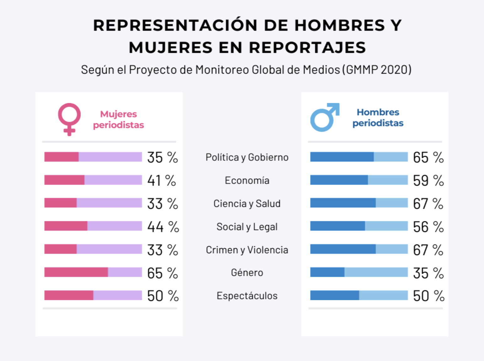 El siguiente gráfico basado en datos del Proyecto de Monitoreo Global de Medios (GMMP) 2020, ilustra de manera visual la proporción de hombres y mujeres periodistas que cubren diferentes áreas temáticas en los medios de comunicación.
