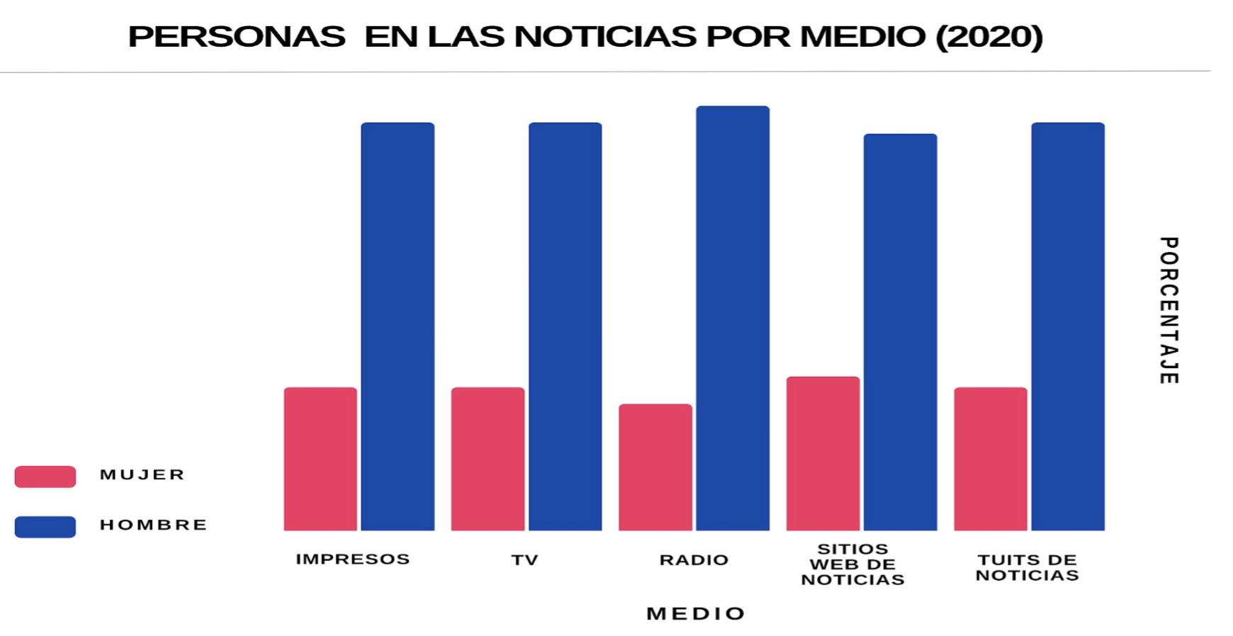 Según datos obtenidos del Proyecto de monitoreo global de datos, pudimos realizar y analizar este gráfico que muestra una clara diferencia de representación entre hombres y mujeres en las noticias por diferentes tipos de medios durante el año 2020. Los hombres dominan en todos los medios analizados, con porcentajes que oscilan entre el 72% y el 77%, mientras que las mujeres tienen una representación significativamente menor, entre el 23% y el 28%.